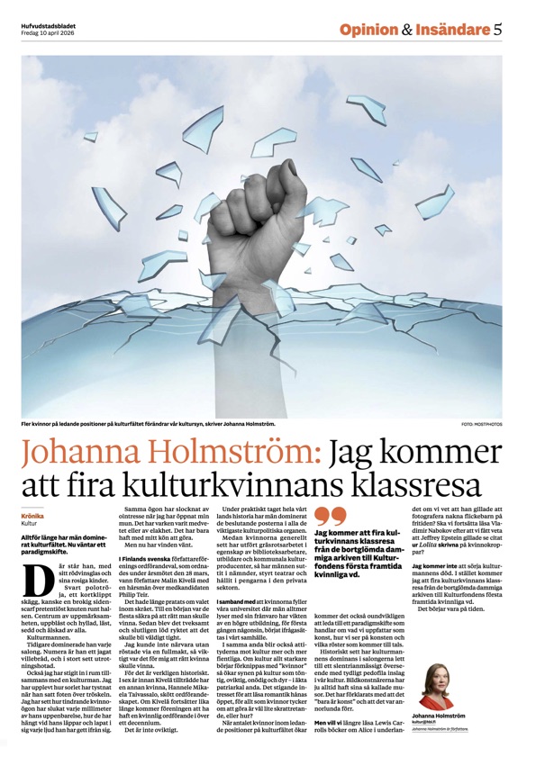 Debatt:Johanna Holmström är sent ute”Bilden av en sliskig ’kulturman’ som får allt ljus på sig har blivit en utnött kliché.”Under 1970-talet blev kvinnorna för första gången fler än männen bland de debuterande medlemmarna i Finlands svenska författareförening, 53 procent. Så har det varit sen dess. Mot den bakgrunden var föreningen sent ute med att för första gången välja en kvinnlig ordförande: som Monika Fagerholm har påpekat på sociala medier dröjde det ända till 1990-talet med Agneta Ara (1996–98). Under 2000-talet hade Mikaela Strömberg posten åren 2007–2013. FSF:s sena start kan jämföras med att kvinnor redan under 1980-talet intog en rad andra ledande positioner inom det finlandssvenska kulturfältet. Bägge de större förlagen fick kvinnliga litterära chefer: Marianne Bargum på Söderströms, Helen Svensson på Schildts. Till och med Svenska kulturfonden leddes en kort tid av Gunilla Hellman. Som Hufvudstadsbladets kulturchef har bland andra Elsa Boström och Tuva Korsström fungerat. Och den dåvarande Riksradions (i dag Yle Vegas) kulturredaktion dominerades av fem i dag legendariska kvinnliga redaktörer, även om chefen var en man.